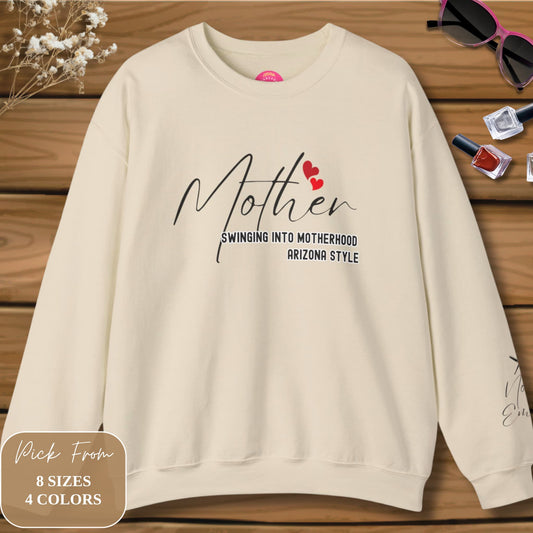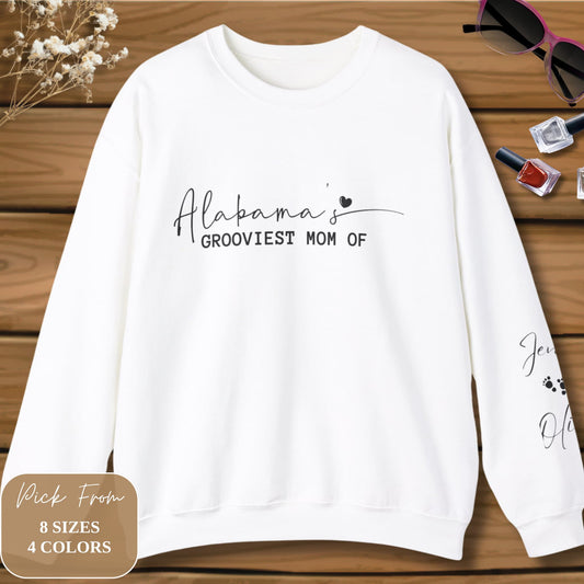 Alabama's Custom Mom Crewneck Gildan Sweatshirt with Kids Name on Sleeve, Gift for Mom with Name