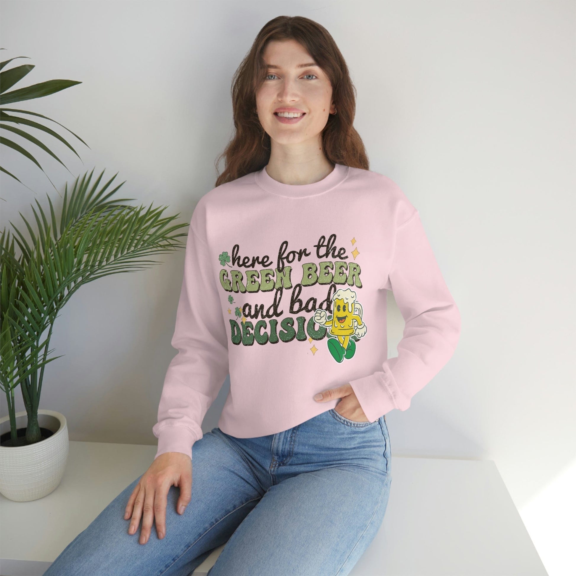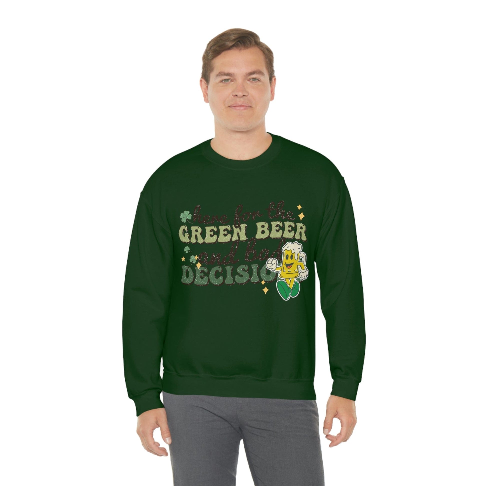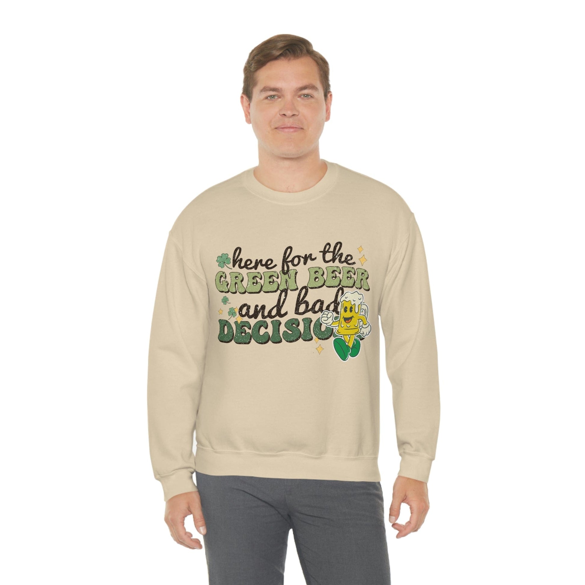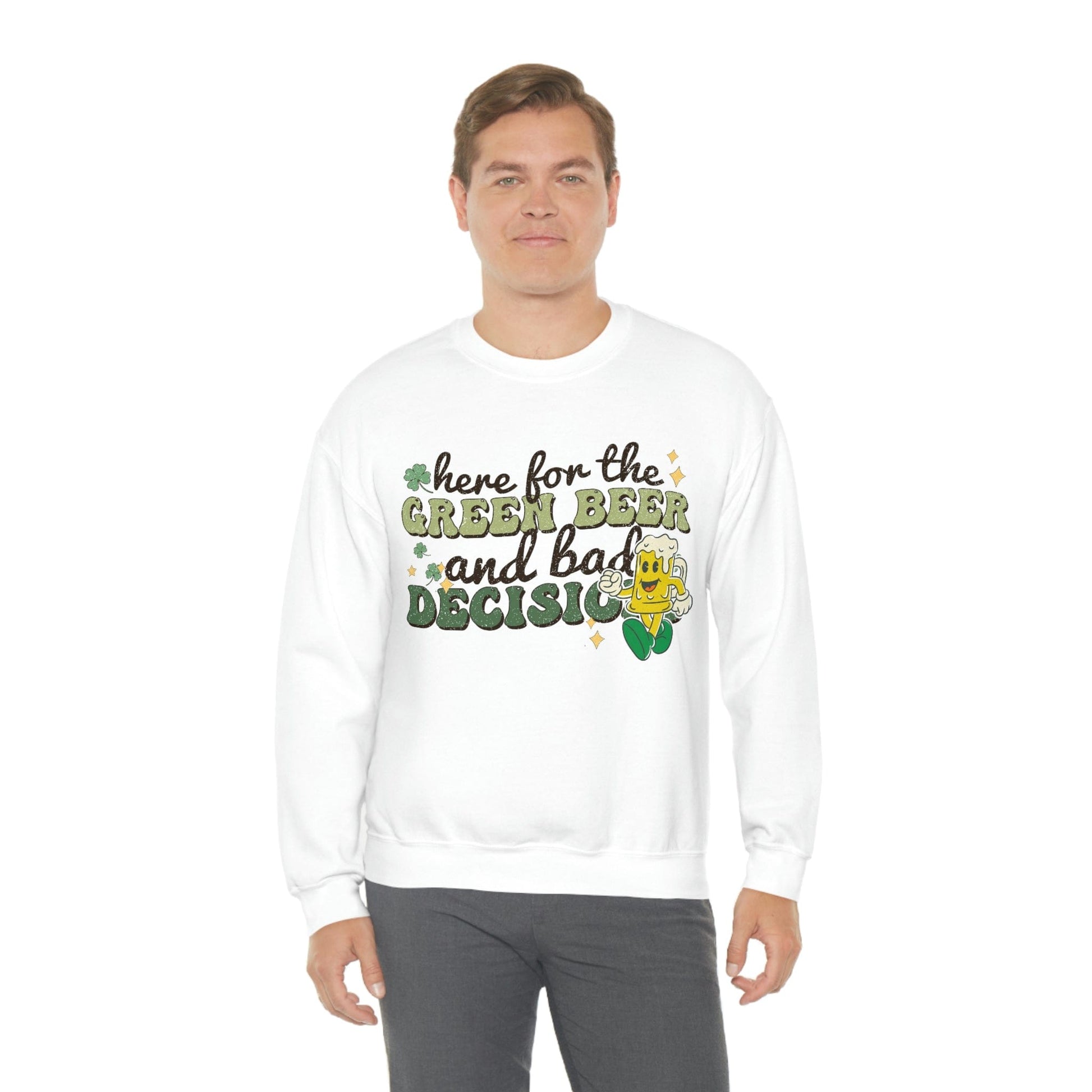 - Featuring a playful and eye-catching design of bold lettering that reads "Here for Green Beer and Bad Decisions", this sweatshirt is perfect adding a touch of sarcasm and humor to their St. Patrick's Day wardrobe.
