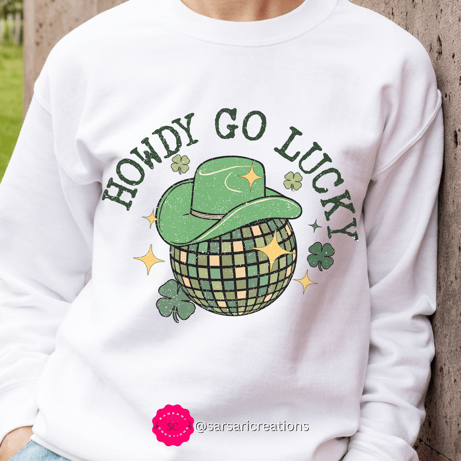 Yeehaw! Get ready to wrangle some laughs and show off your Irish pride with the "2023 Funny Sarcastic St. Patrick's Day Unisex Irish Howdy Go Lucky Cowboy Sweatshirt" from Sarsari Creations.