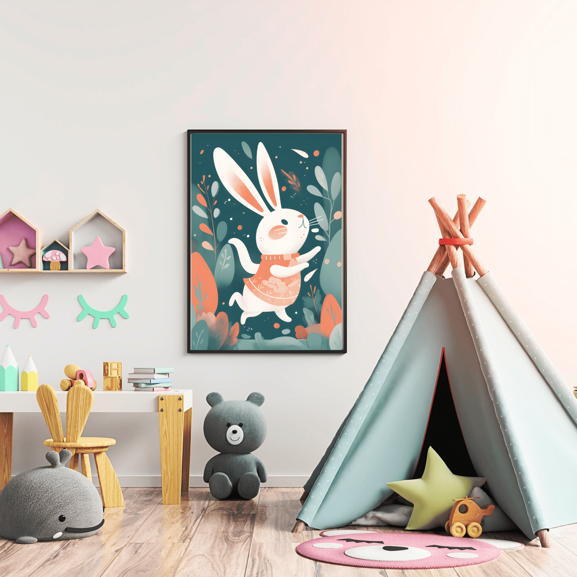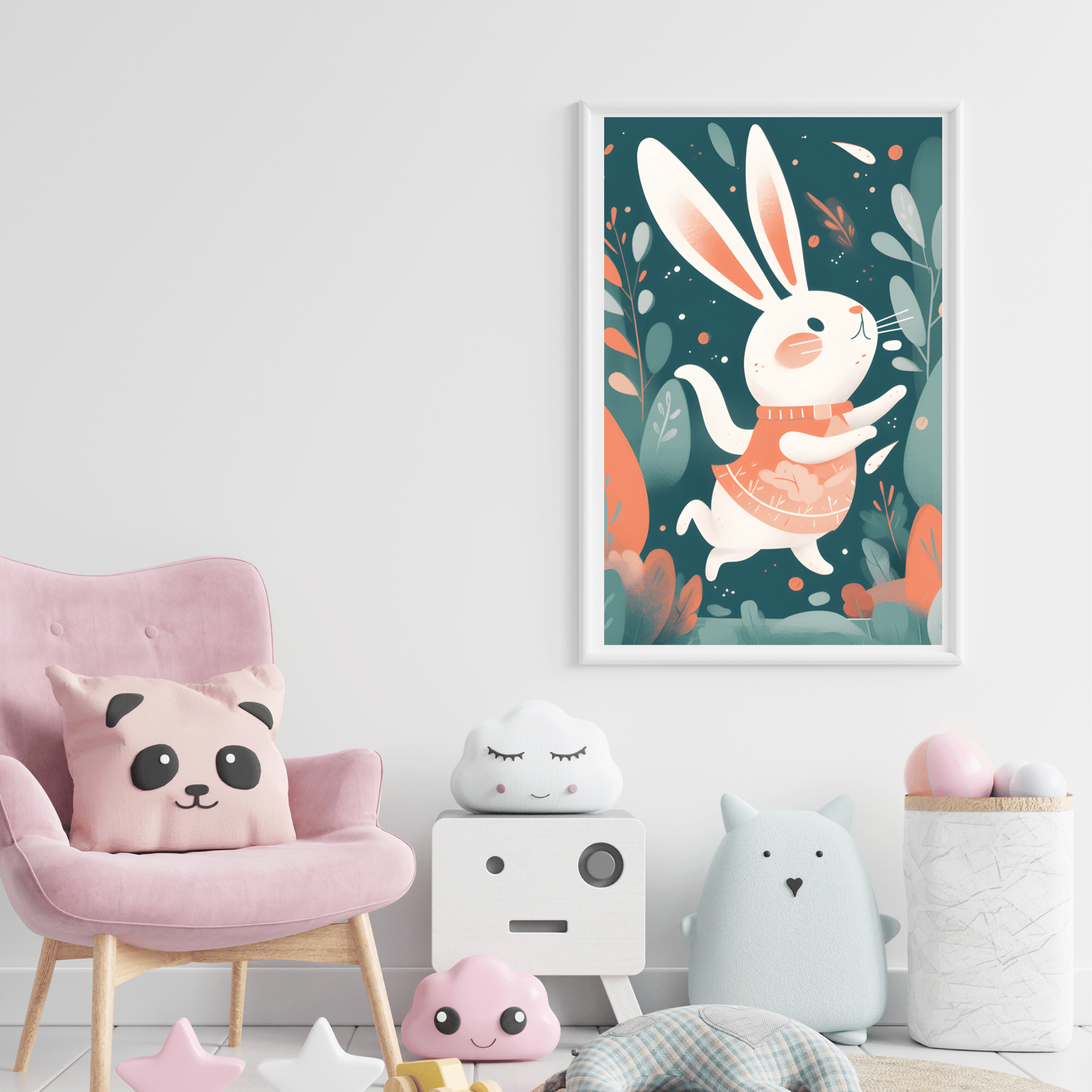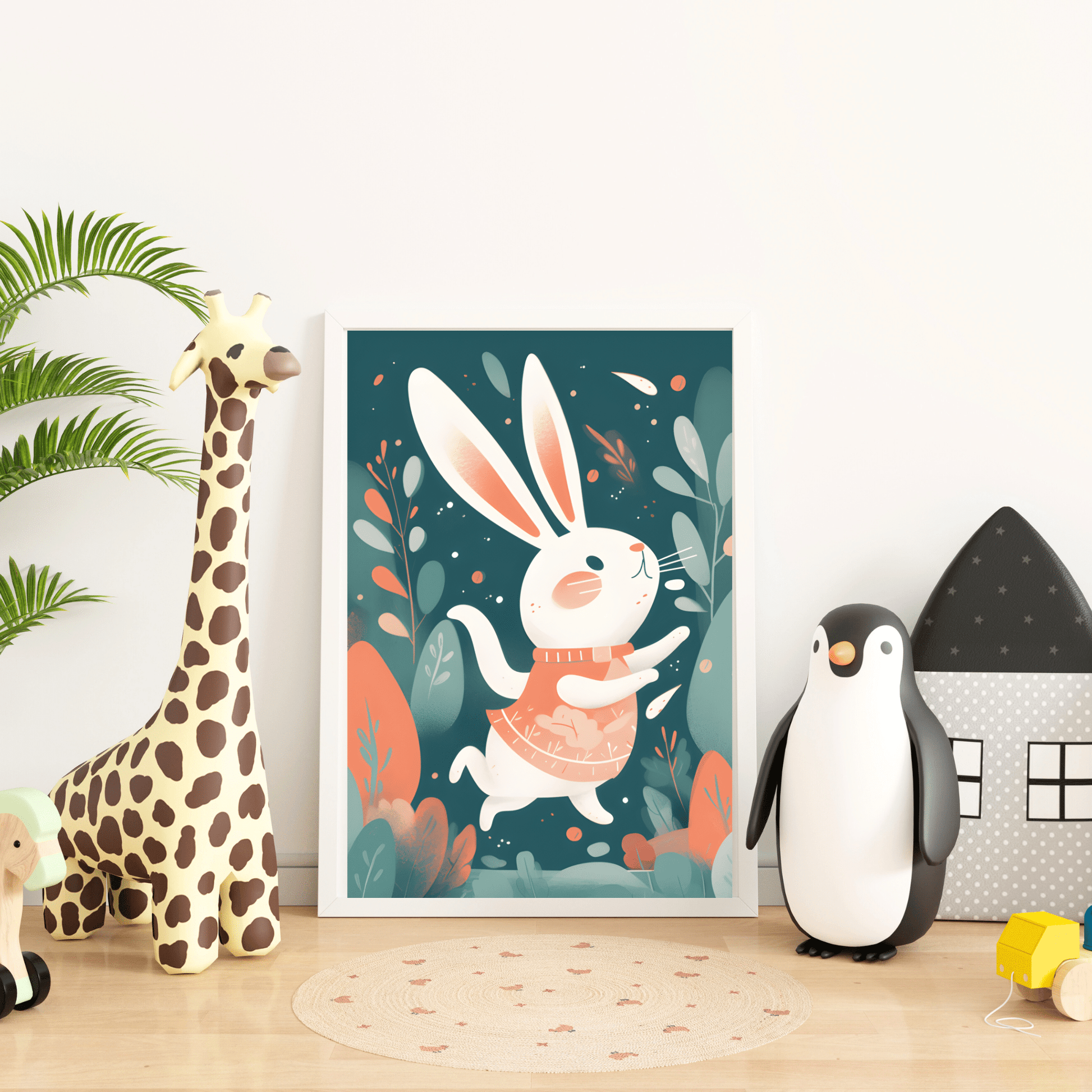 - This Bunny Print features a delightful bunny character, vibrant colors, and a touch of whimsy.