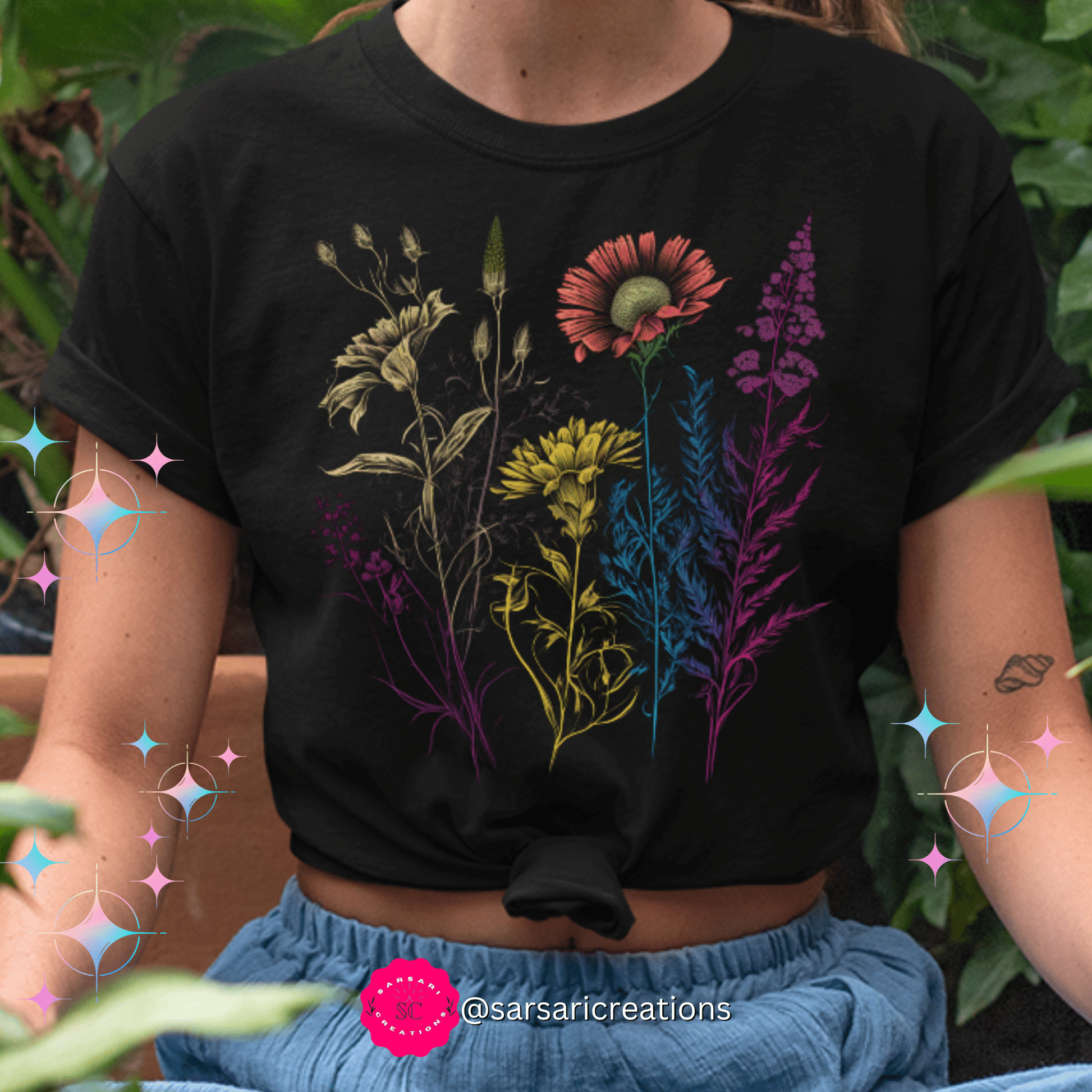 Introducing the 2023 Unisex Boho Pressed Nature Wildflower Blooming Wild Floral Shirt from Sarsari Creations. This exquisite t-shirt is perfect for gardening enthusiasts and nature lovers alike.
