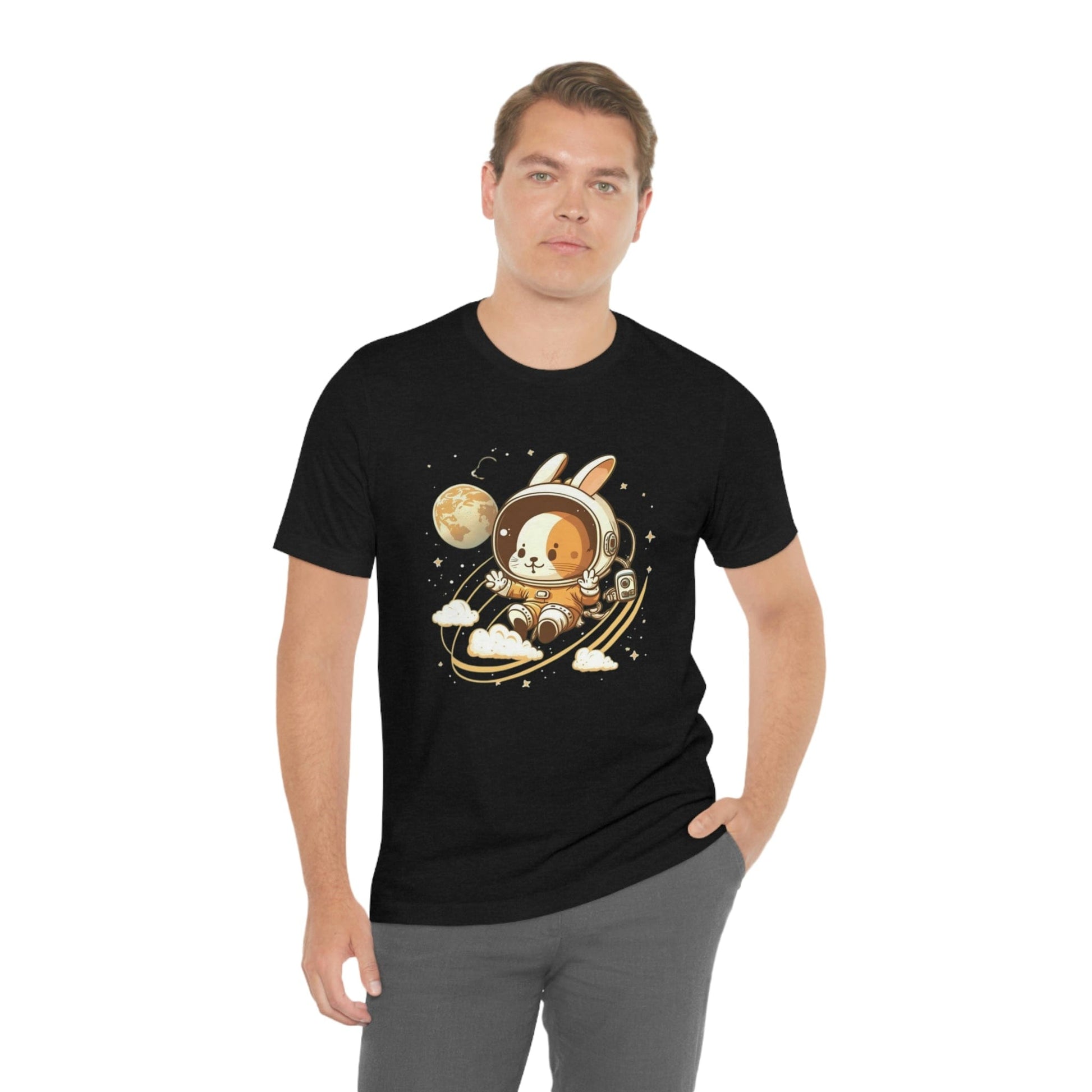 - The t-shirt features an eye-catching Easter bunny astronaut design, complete with a space helmet and a carrot-shaped rocket ship.