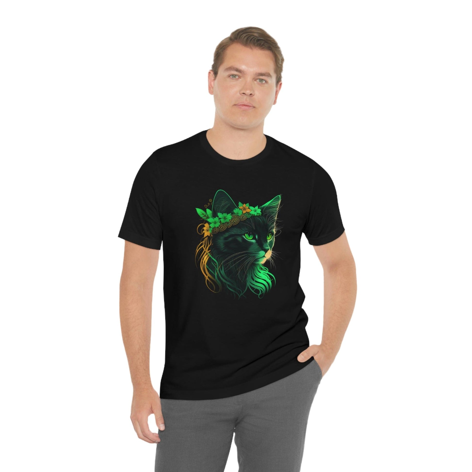 The vibrant green color and eye-catching design are sure to make you stand out from the crowd and bring a smile to everyone's face. Whether you're heading to a parade, party, or simply enjoying the day with friends and family, this t-shirt is the perfect way to show off your Irish pride and love for cats.