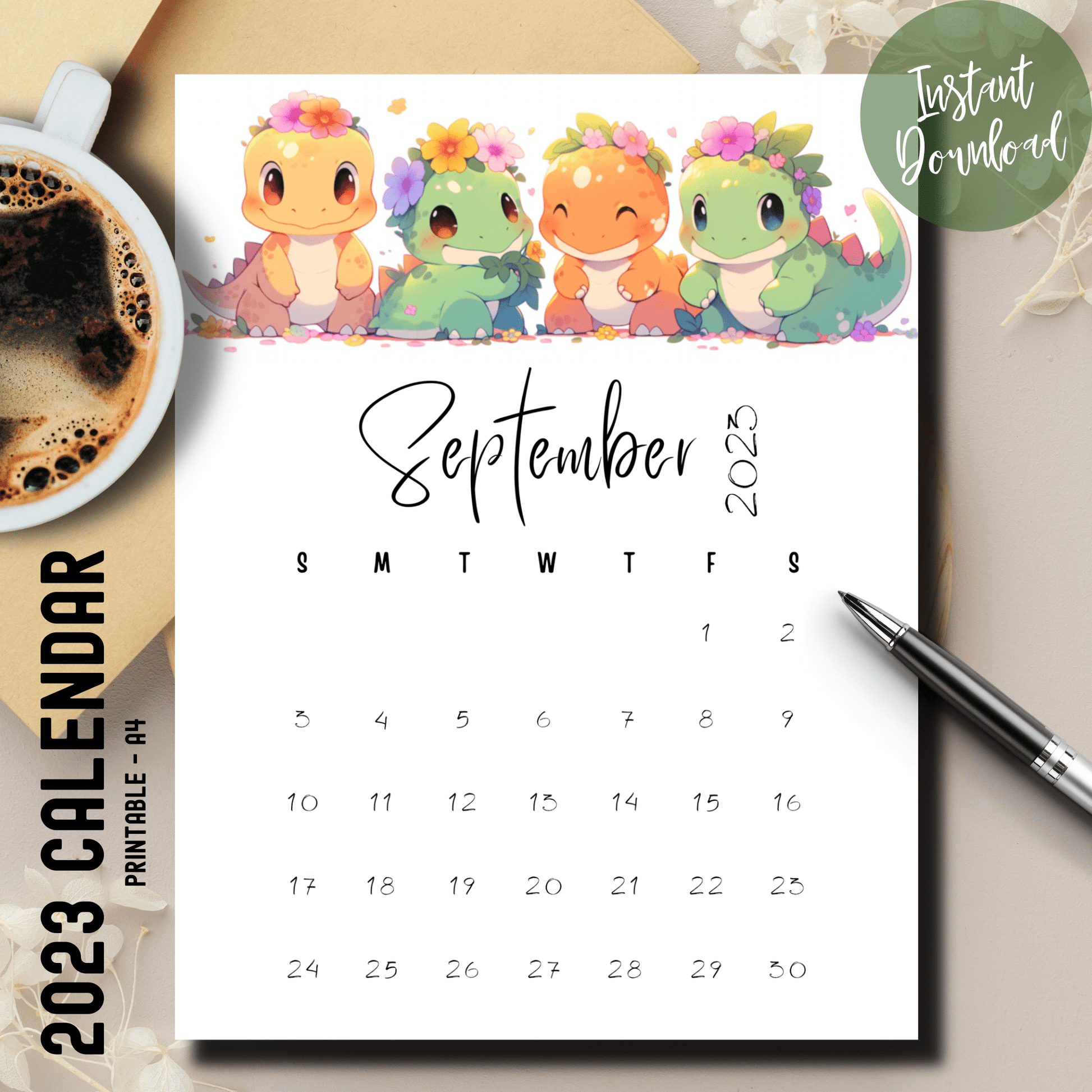 Stomp into September with our Dino-themed calendar for 2023! Decorated with adorable dinosaur illustrations, this calendar transforms routine planning into an adventure through time.