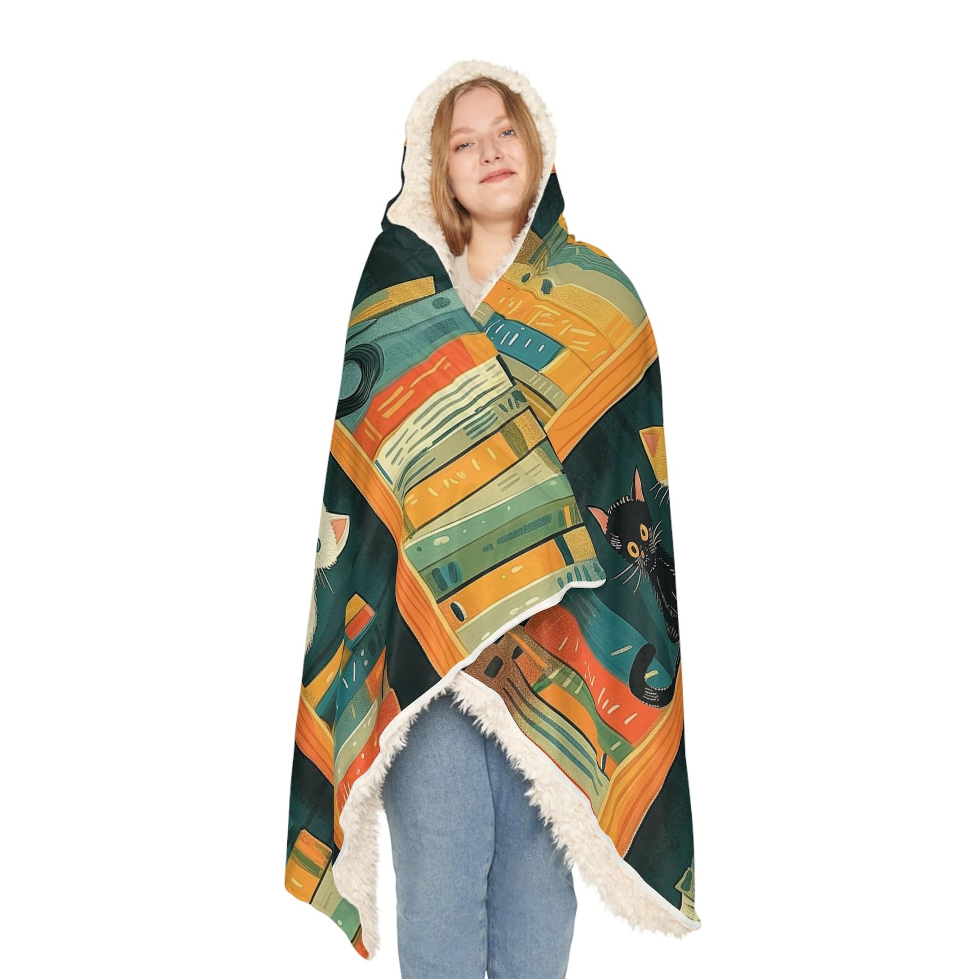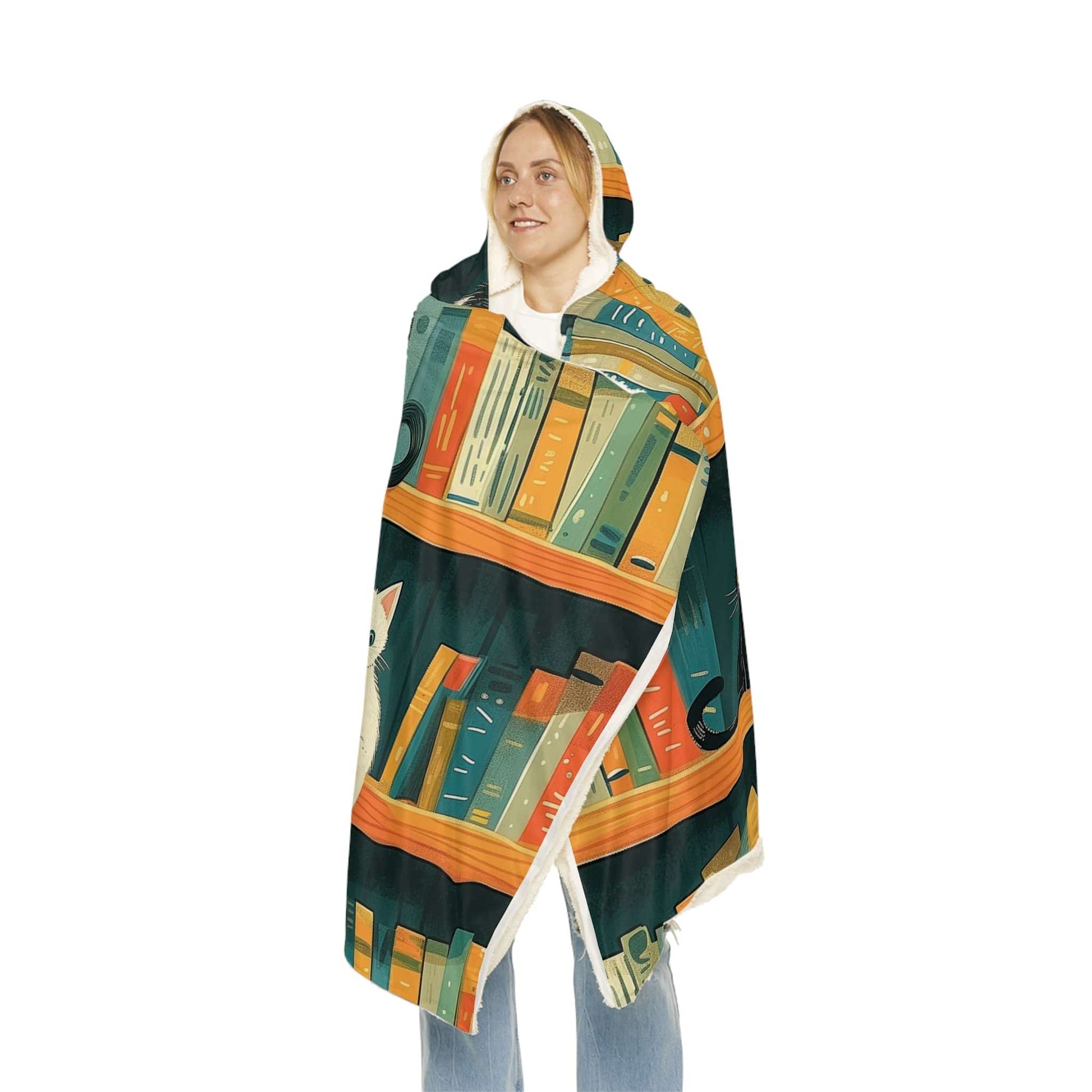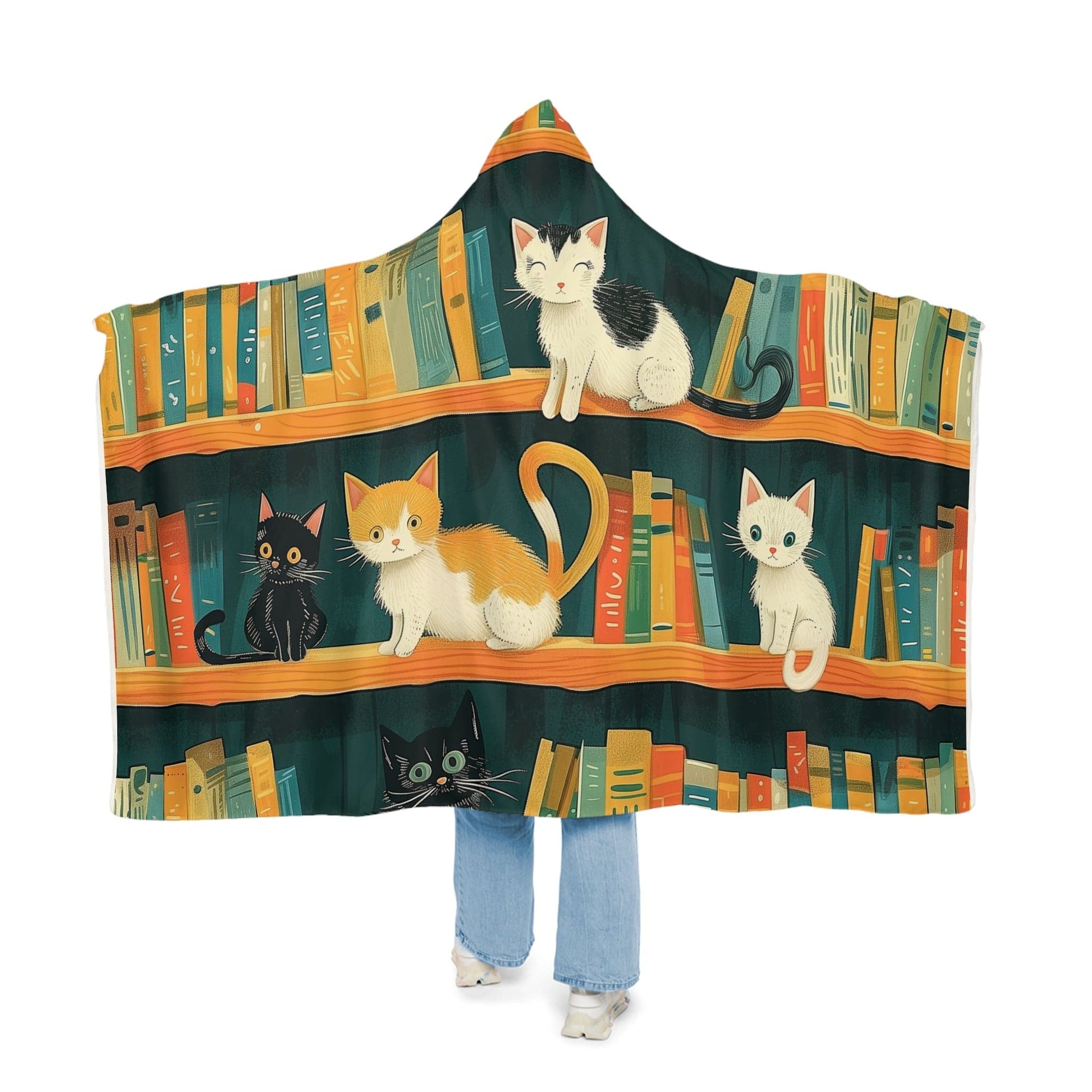 Embrace a cozy reading session with our Snuggie Hoodie, adorned with small funny kittens on a book shelve design. Tailored for book lovers and cat enthusiasts alike!
